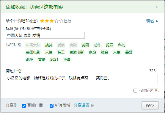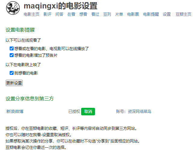 小站的“观影记录”页面,是通过同步豆瓣网站标注的电影和书籍信息,自动生成的。因此在看了电影或书籍后,我都会在豆瓣上进行标注。而在标注的同时,我会将信息同步分享到豆瓣广播和新浪微博。